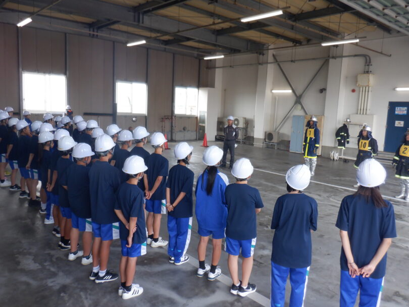 その後、デモンストレーションとして、消防車による放水訓練の様子を見てもらいました。
