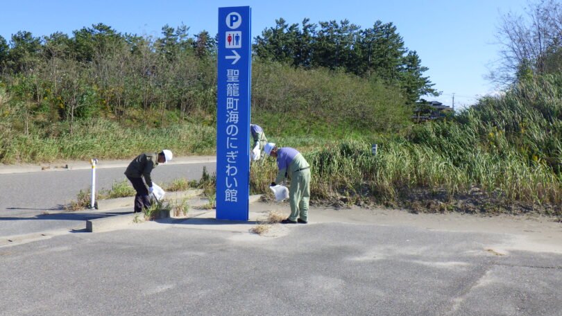 聖籠町海のにぎわい館周辺の清掃の様子です。